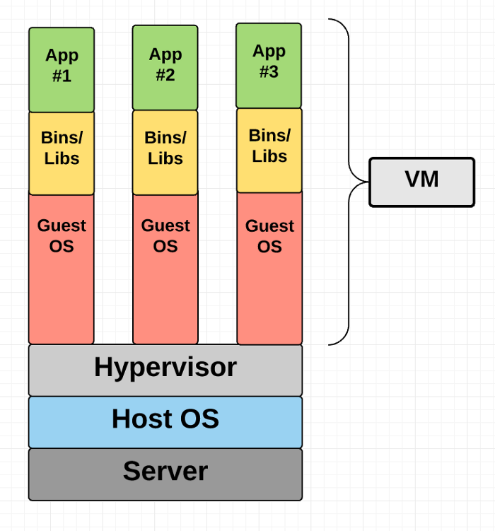 호스트 머신 위에서 하이퍼바이저를 이용하여 돌아가는 VM을 보통 게스트 머신(“guest machine”) 이라고도 부른다. 이 게스트 머신은 보통 그 애플리케이션을 실행하기 위한 모든 것(시스템 바이너리, 라이브러리 등)과 애플리케이션을 포함하며, 가상화된 네트워크 어댑터, 저장소, CPU등의 모든 하드웨어 스택도 포함한다. 즉, 자신 안에 또 하나의 온전한 게스트 운영체제를 가지고 있는 것이다.